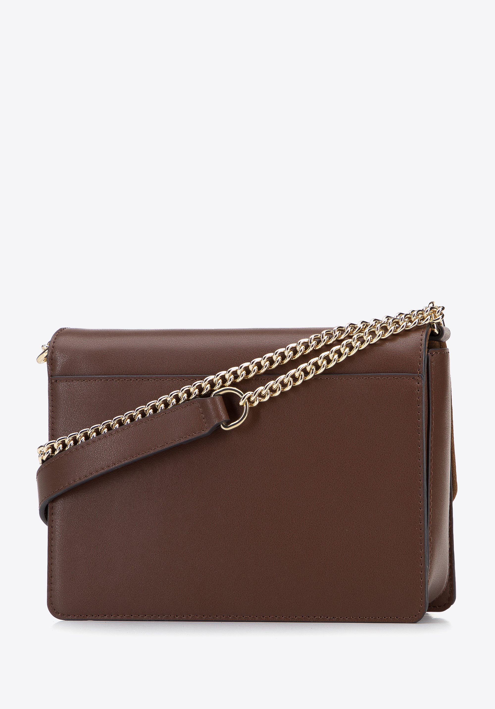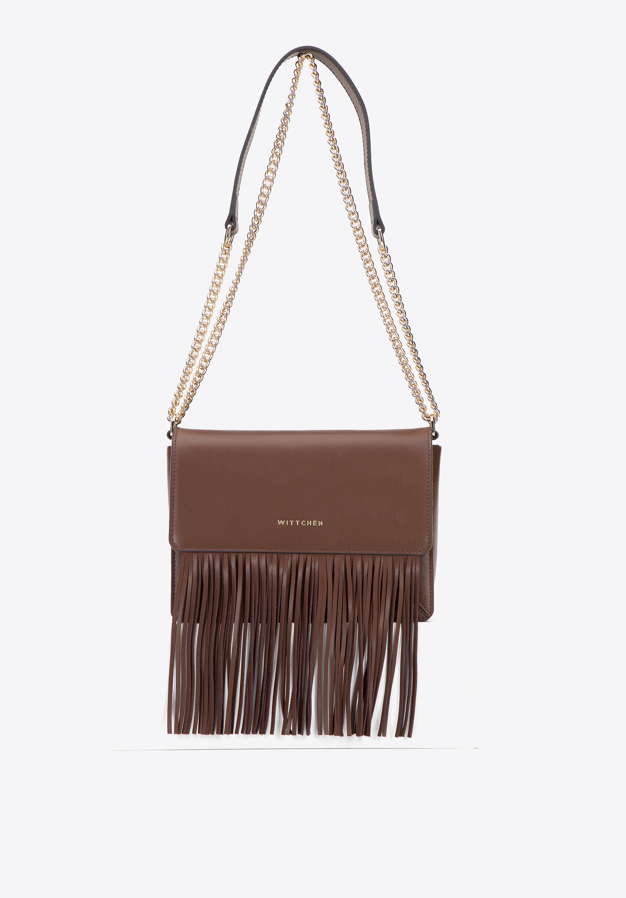 Diese kleine Damenhandtasche bringt einen neuen Stil in Ihre Garderobe. Das klassische Design der Postbotentasche wurde mit Fransen angereichert, die über den unteren Rand der Tasche hinausragen. Der Glamour wird durch eine stilvolle Goldkette verstärkt, die Sie auf zwei Arten tragen können: Falten Sie sie in der Mitte und hängen Sie die Tasche über die Schulter, oder nutzen Sie die gesamte Länge der Kette und werfen Sie sie diagonal. Diese Umhängetasche ist aus hochwertigem Naturleder gefertigt, sodass sie Ihnen lange dienen wird. Darin passen Handy, Portemonnaie, ein kleiner Kalender, Ersatzhandschuhe und ein paar Kleinigkeiten hinein – perfekt für einen Spaziergang, ins Kino oder zum Ausgehen mit Freunden. Dieses Modell ist eine großartige Ergänzung zum kleinen Schwarzen und verleiht Ihrer Lieblingsjeans und Ihrem Lieblingshemd Stil. Die Umhängetasche aus Leder für Damen mit Fransen ist ein Accessoire, das viele Blicke auf sich ziehen wird.