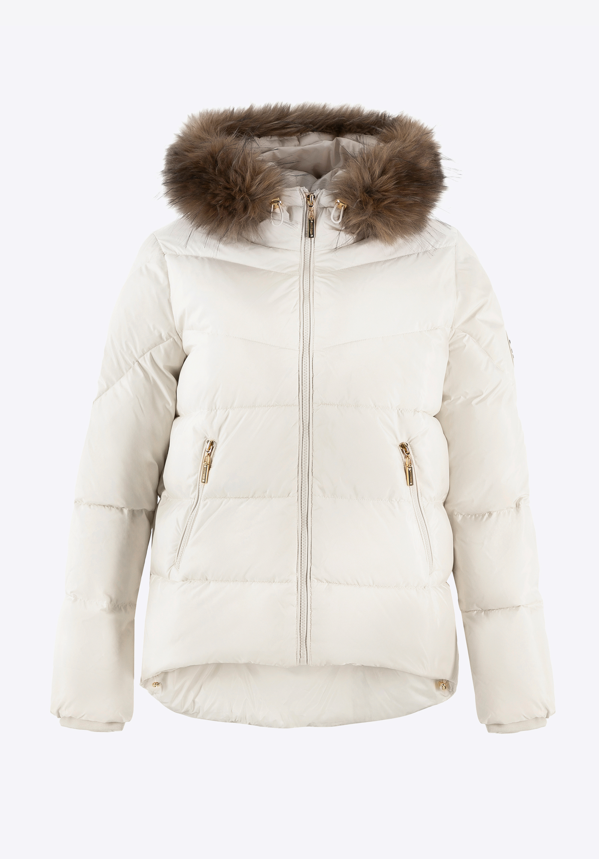 Diese Damenjacke vereint Stil, Komfort und Funktionalität. Sie ist aus leicht glänzendem Nylon gefertigt und bietet sowohl Windbeständigkeit als auch bemerkenswerte Leichtigkeit. Diese mit Daunen und Federn isolierte Jacke sorgt selbst bei kältestem Wetter für außergewöhnliche Wärme und Komfort. Werten Sie Ihre Wintergarderobe mit der abnehmbaren Kapuze mit Kunstpelz auf, die nicht nur einen stilvollen Touch verleiht, sondern auch zusätzlichen Schutz vor der Kälte bietet.