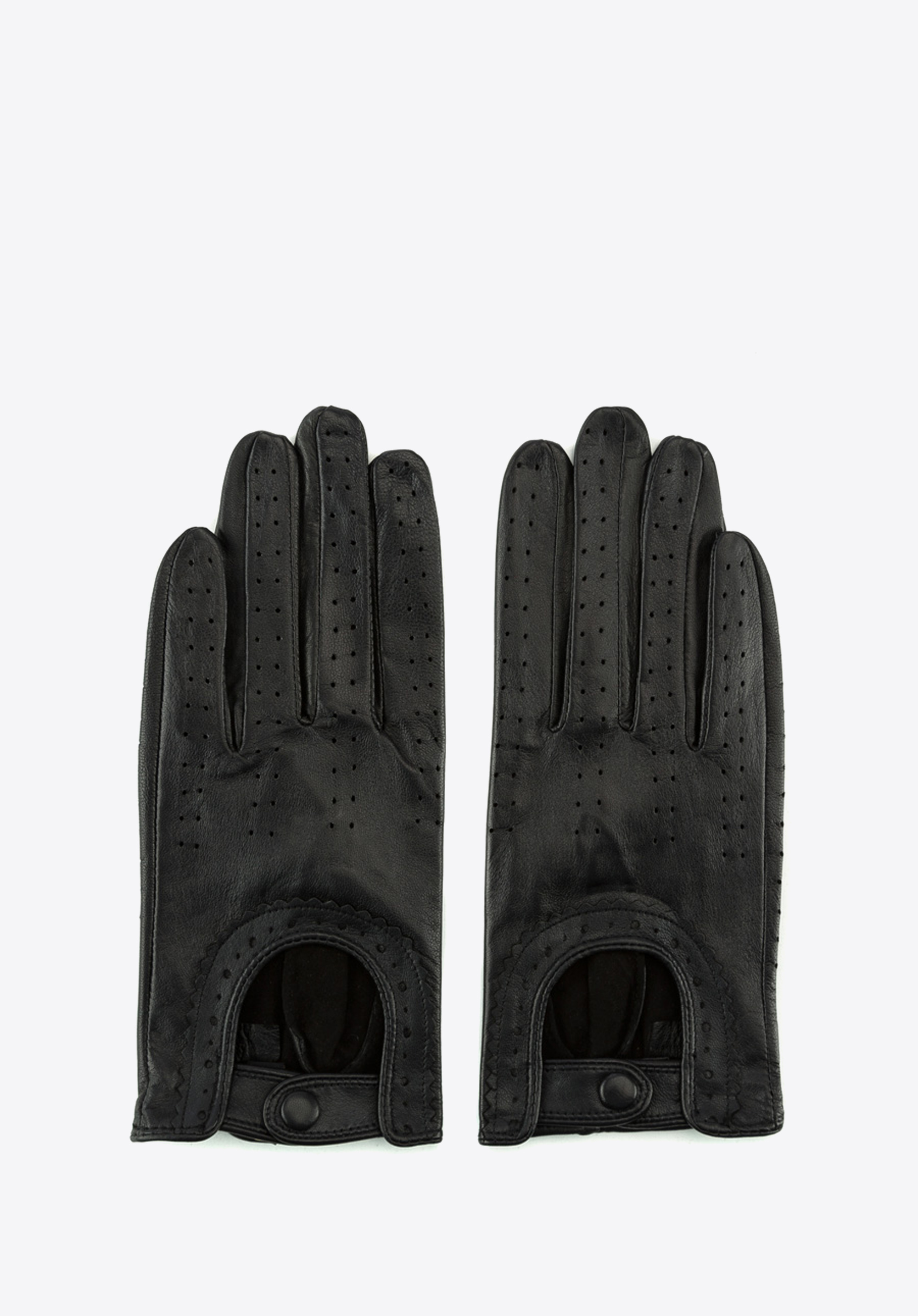 Die stilvollen Autofahrerhandschuhe werden aus perforiertem Schafsleder von höchster Qualität hergestellt. Dieses Modell wurde mit bequemem Druckknopfverschluss ausgestattet, der für die perfekte Passform sorgt. Das praktische Accessoire betont jeden femininen Look.