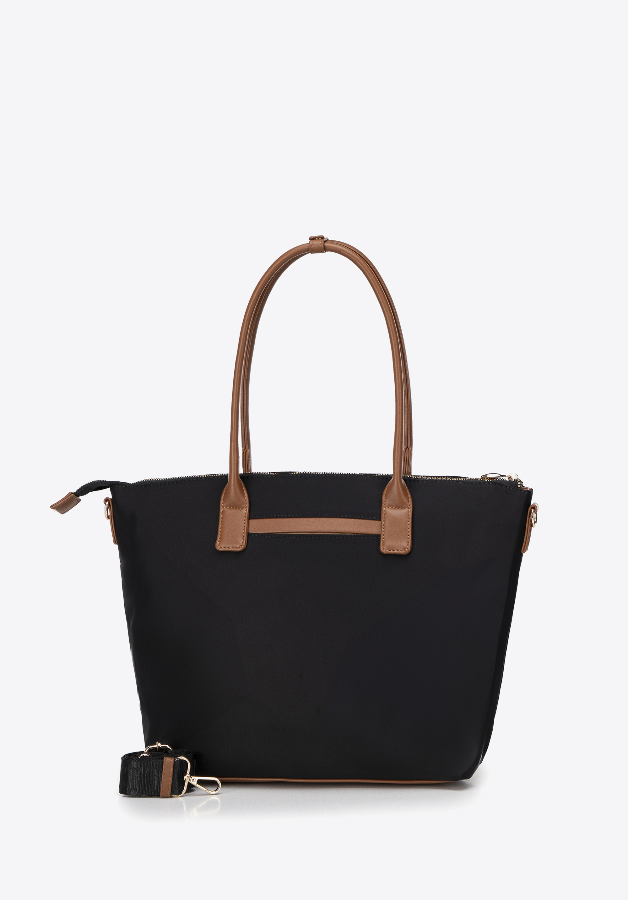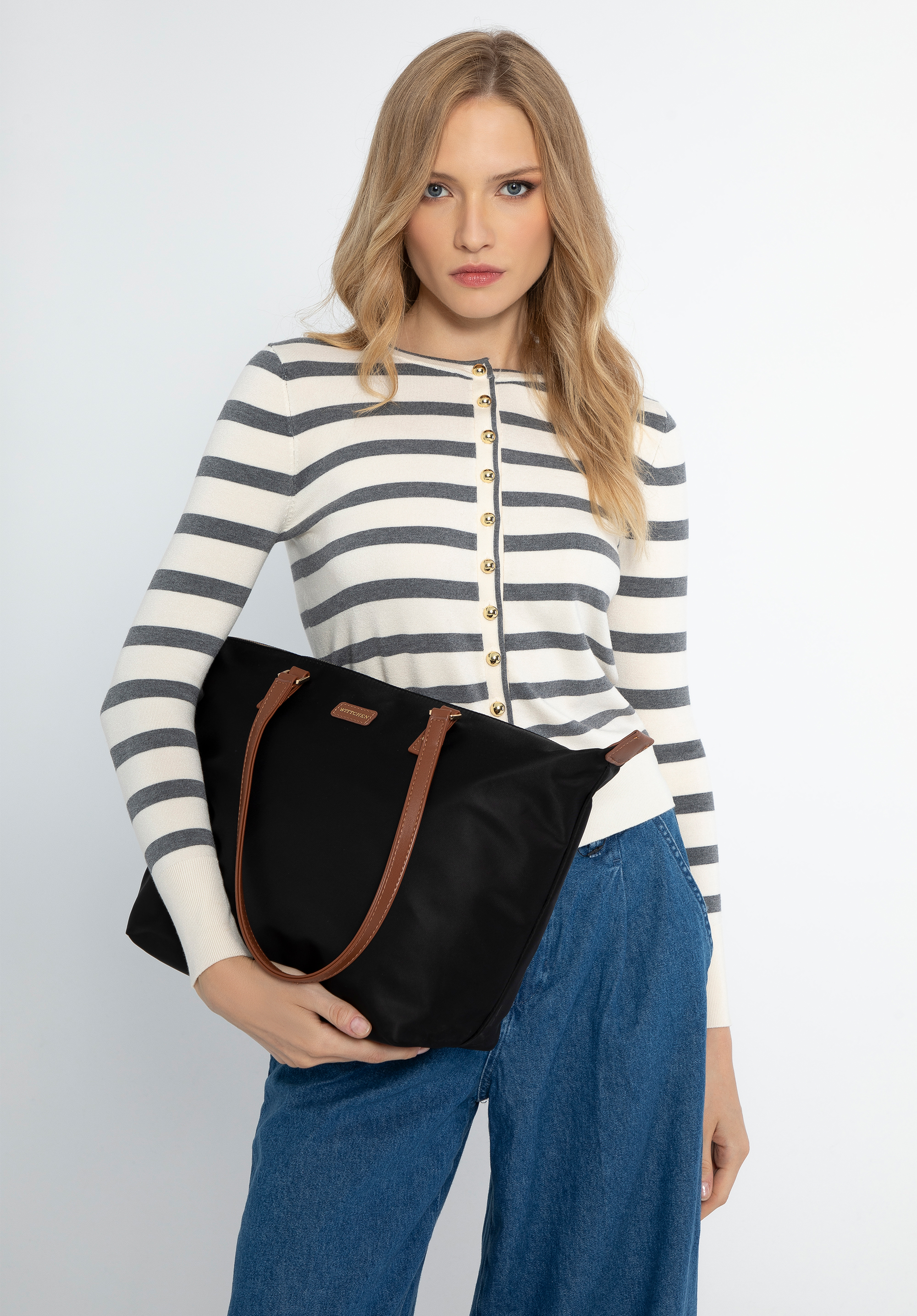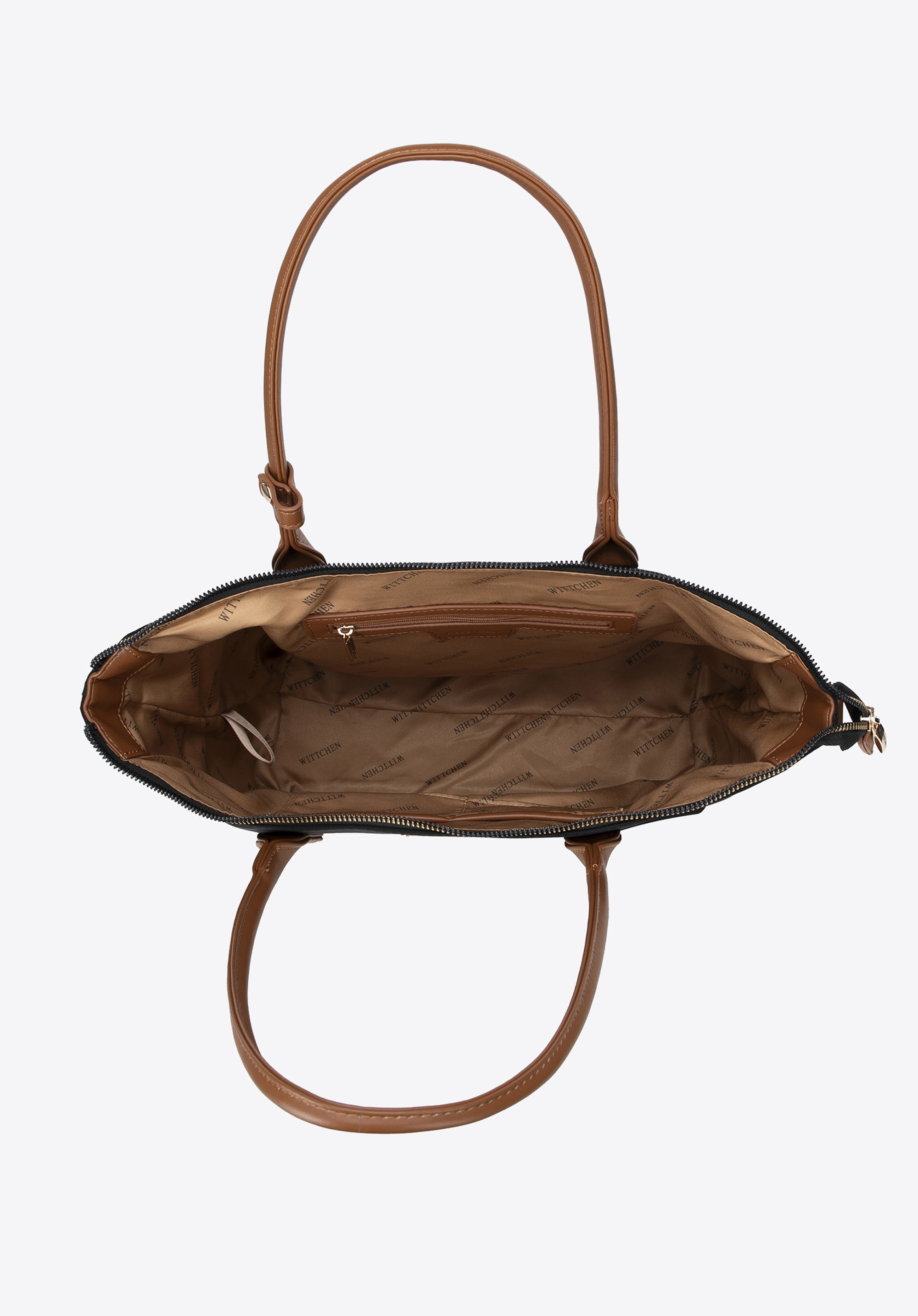 Entdecken Sie unsere einzigartige Damenhandtasche, die Eleganz und Zweckmäßigkeit vereint. Das Modell verfügt über zwei Griffe mit Knopfverschluss, die das Tragen der Tasche erleichtern. Auf der Rückseite der Shopper-Tasche befindet sich ein offenes Fach, das sich perfekt für die kleinen Dinge eignet, die Sie immer griffbereit haben möchten. Dank des gepolsterten Bodens behält die Tasche ihre Form und Stabilität, unabhängig von ihrem Inhalt. Der Innenraum der Shopper-Tasche mit nur einem Fach und Reißverschluss ist eine wahre Symphonie der Organisation. Ein zusätzliches Plus ist der verstellbare und abnehmbare Trageriemen, mit dem Sie die Tasche je nach Bedarf auf unterschiedliche Weise tragen können.