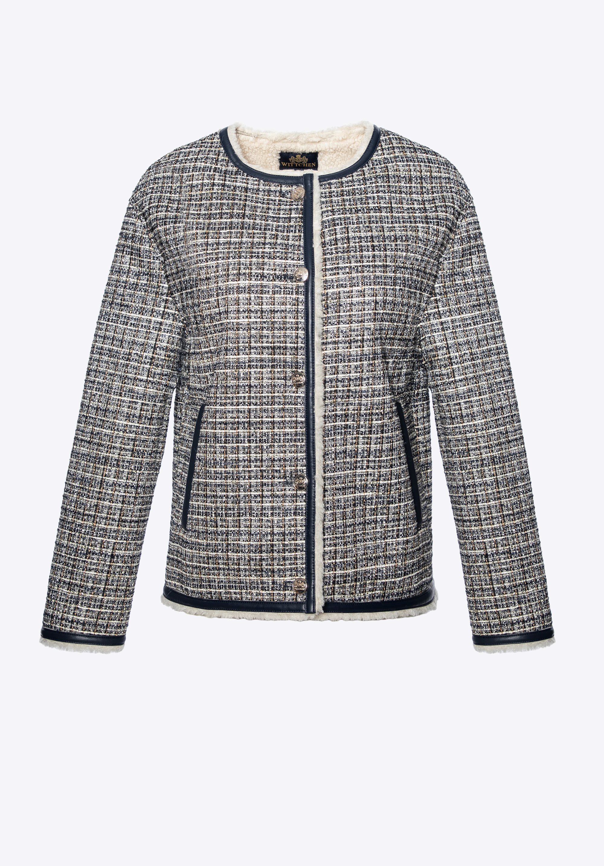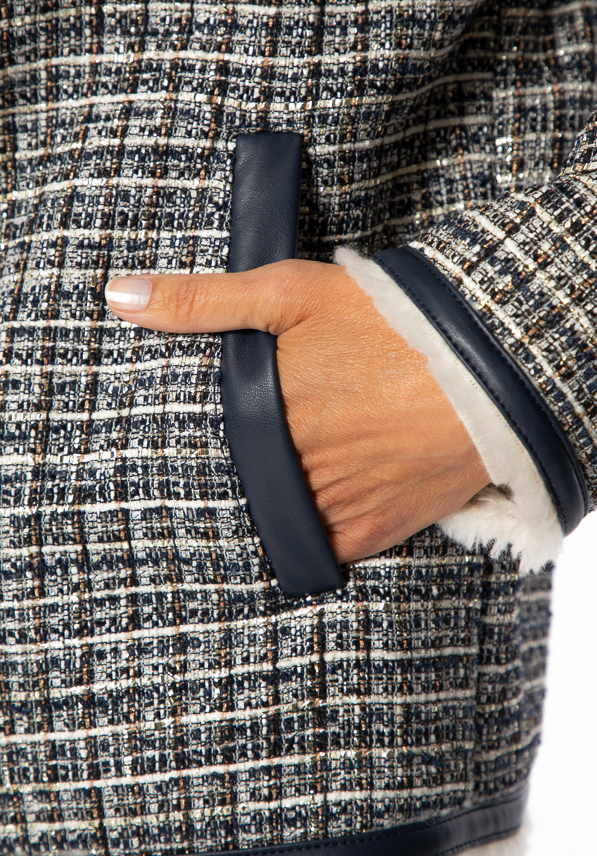 Tauchen Sie ein in klassische Eleganz mit modernem Touch mit dieser einzigartigen Tweedjacke . Gefertigt aus strukturiertem Polyester mit dezenten, mehrfarbigen Garnen besticht sie durch ihren unverwechselbaren Charakter. Die präzise Verarbeitung mit kontrastierenden Besätzen und glänzenden Goldknöpfen unterstreicht den raffinierten Stil dieses Kleidungsstücks. Innen ist die Jacke mit einem warmen, weichen Kunstfellfutter ausgestattet, das auch bei winterlichen Temperaturen für Komfort sorgt. Praktische Taschen erhöhen die Funktionalität, während der gerade Oversize-Schnitt Bewegungsfreiheit und hohen Tragekomfort garantiert.