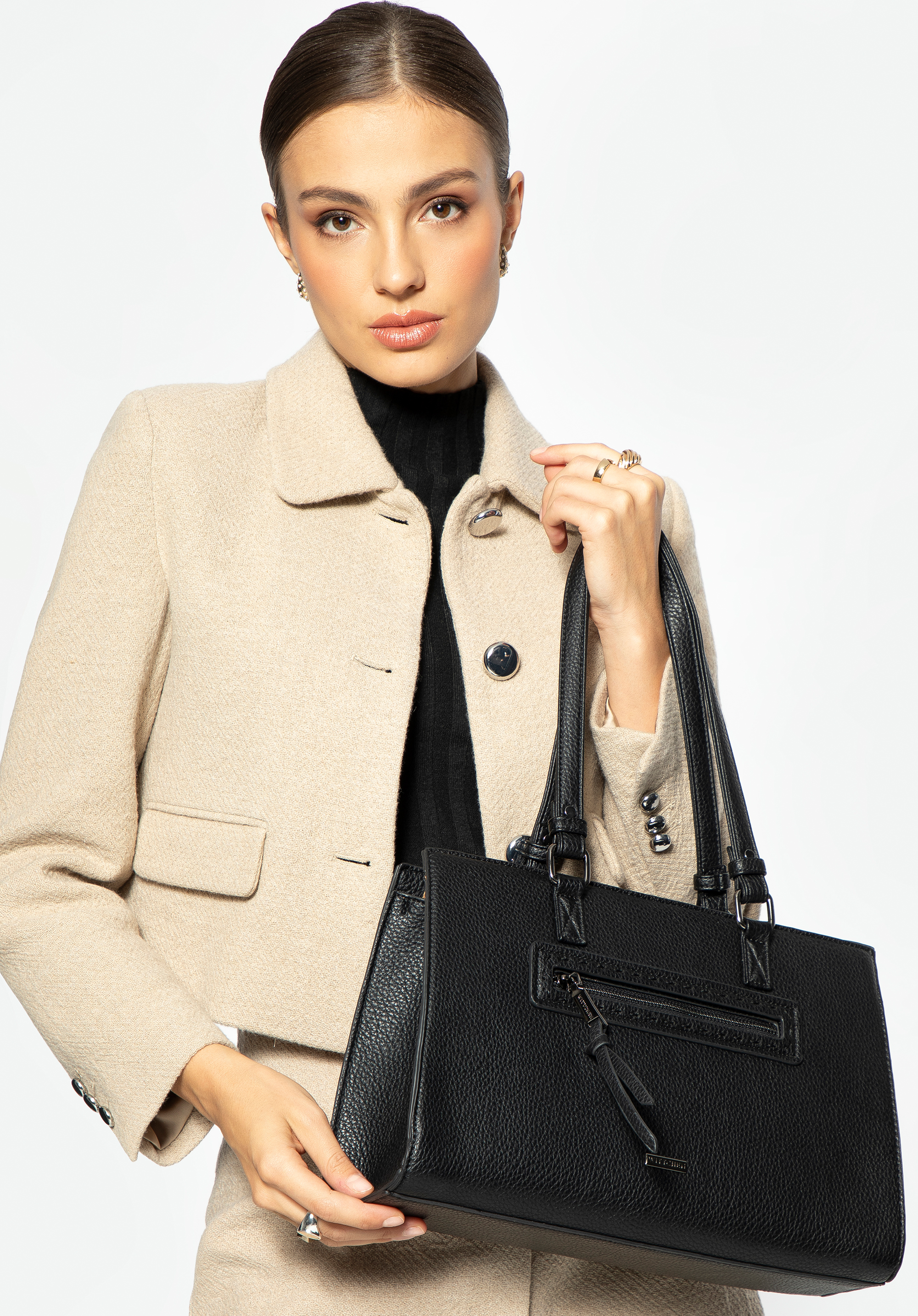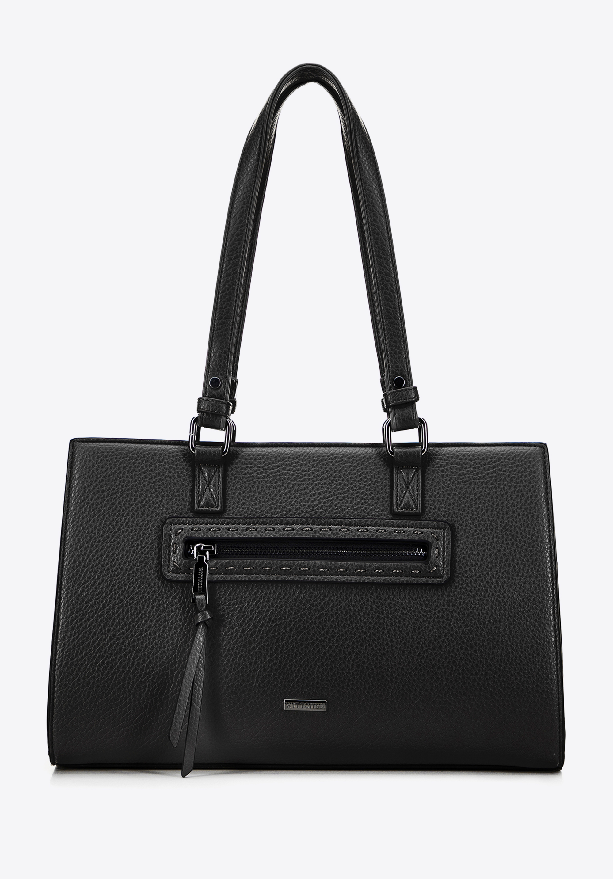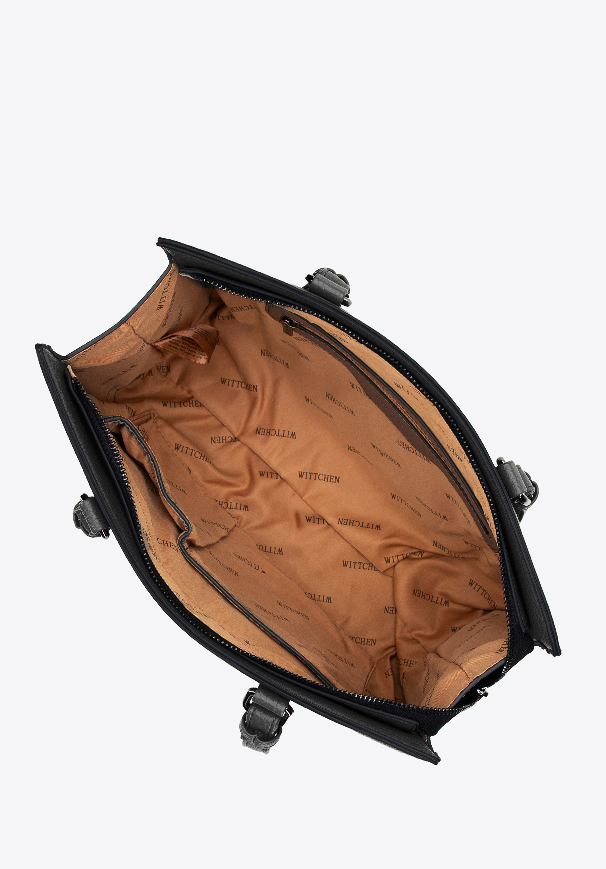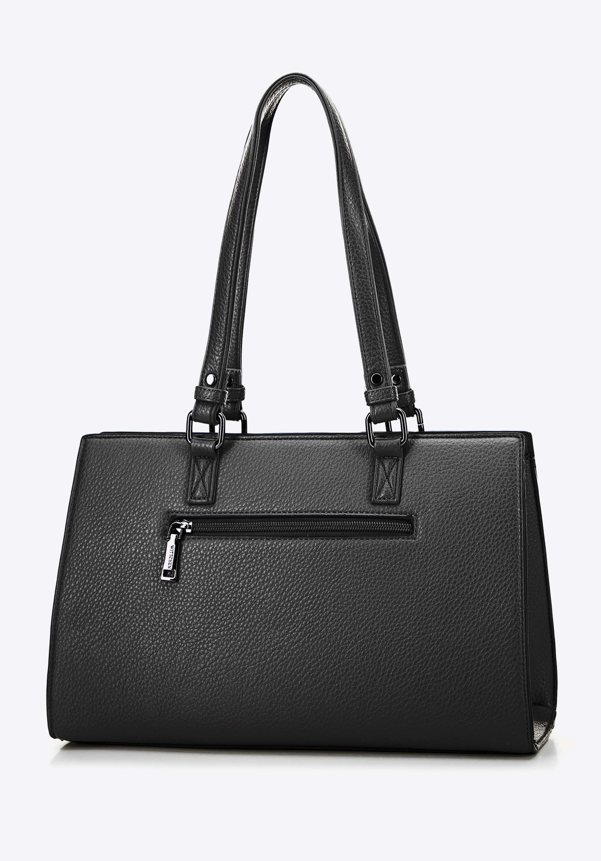 Unsere außergewöhnliche Damenhandtasche aus Kunstleder ist die Essenz von Eleganz und Funktionalität. Der stabile Boden und die zwei eleganten Tragegriffe garantieren nicht nur Komfort, sondern auch Langlebigkeit im täglichen Gebrauch. Der einteilige Innenraum macht die Organisation Ihrer Sachen unglaublich einfach. Hier finden Sie alles, was Sie brauchen: Zwei kleine offene Taschen und eine Reißverschlusstasche bieten zusätzlichen Platz für Kleinigkeiten. Externe Reißverschlusstaschen auf beiden Seiten der Handtasche gewährleisten schnellen Zugriff auf wichtige Gegenstände. Die mit Ziernähten verzierte Vordertasche verleiht Eleganz und Stil. Das WITTCHEN-Logo , das sowohl auf der Vorderseite als auch im Inneren der Handtasche sichtbar ist, unterstreicht den einzigartigen Charakter und die hohe Qualität des Produkts.