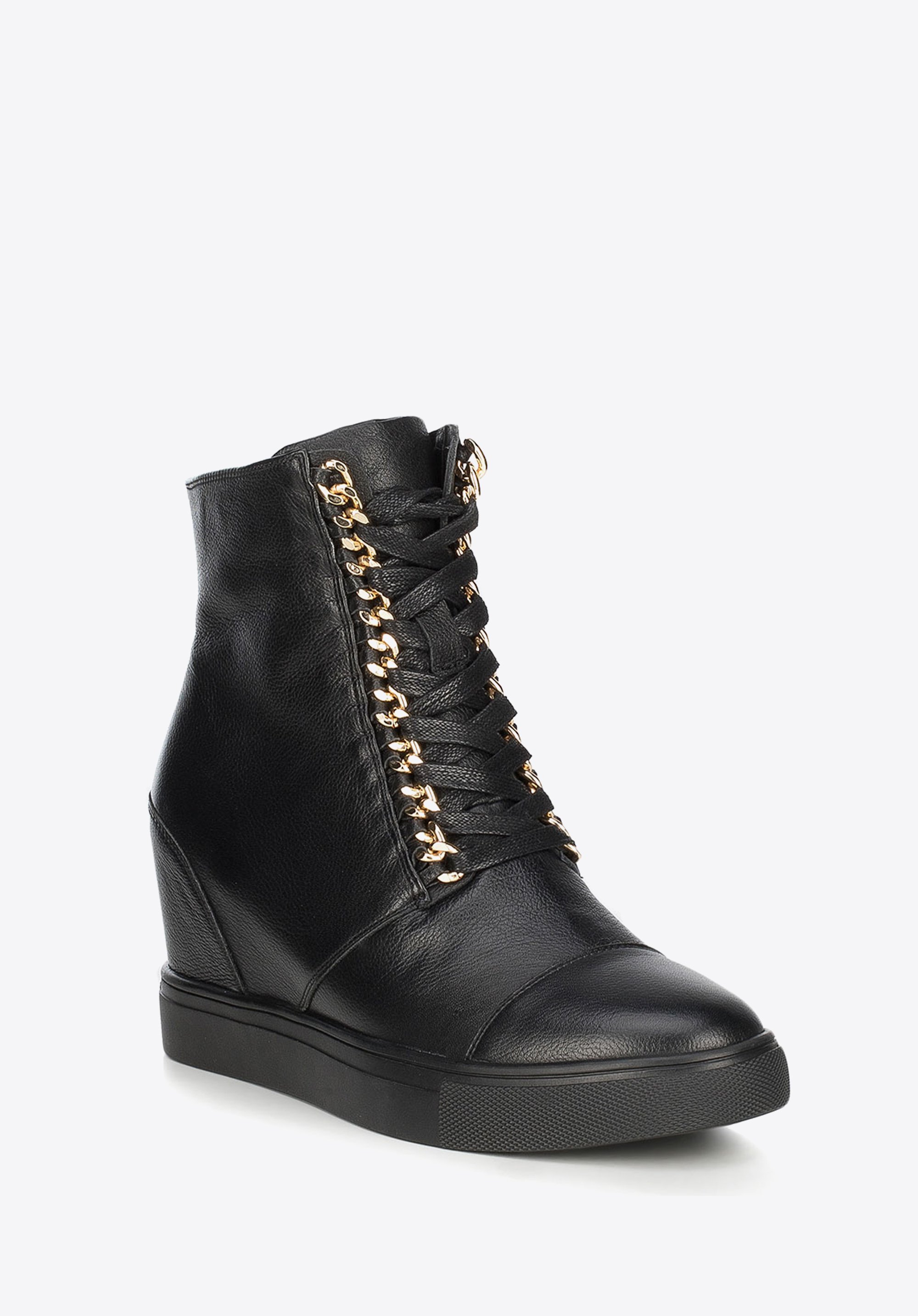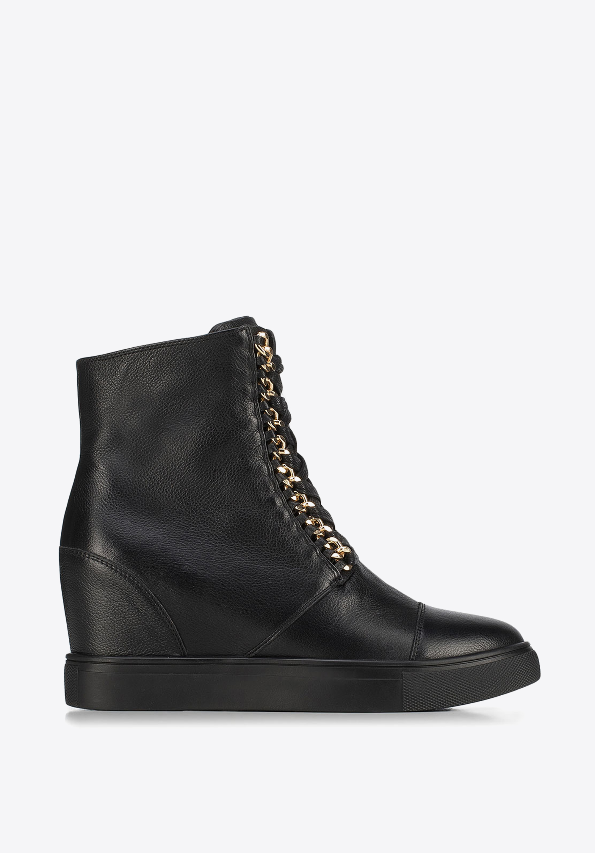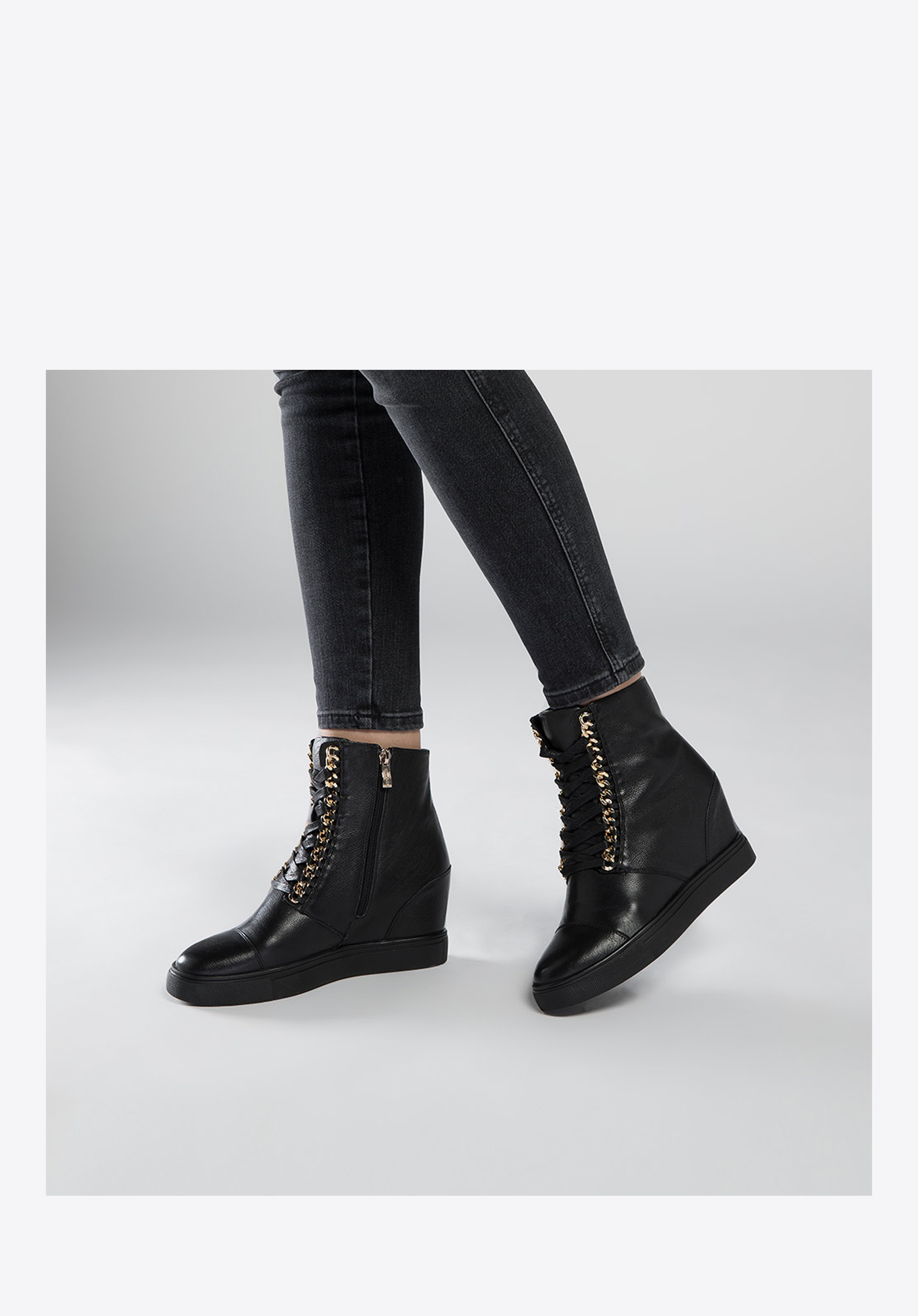 Schwarze Keilstiefel aus hochwertigem Naturleder. In diesen dynamischen Stiefeln können Sie sich auf alles gefasst machen. Mit goldfarbenen Kettenakzenten und einem verdeckten Keilabsatz für Komfort und Stil. Unser Tipp : Schlichtes und dennoch stylisches Design - perfekt für die Kombination mit lässigen Outfits .