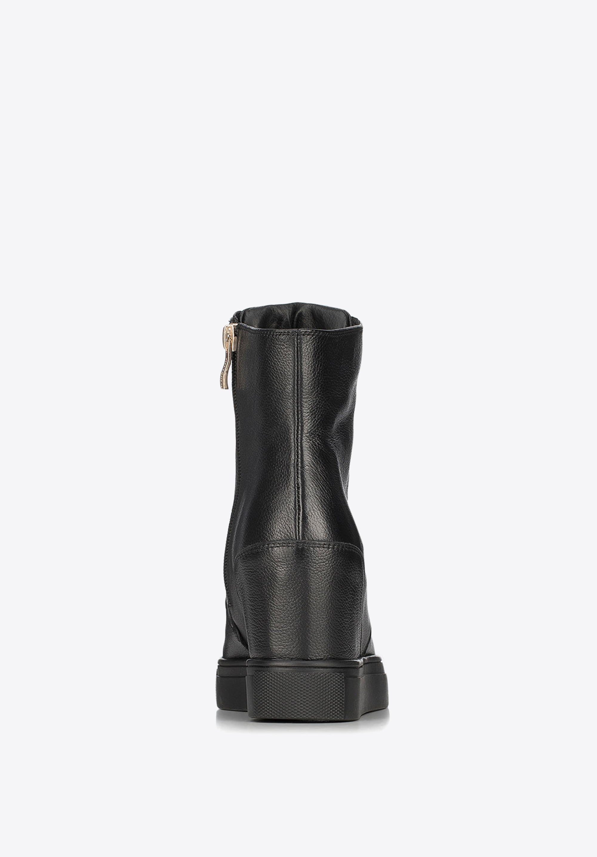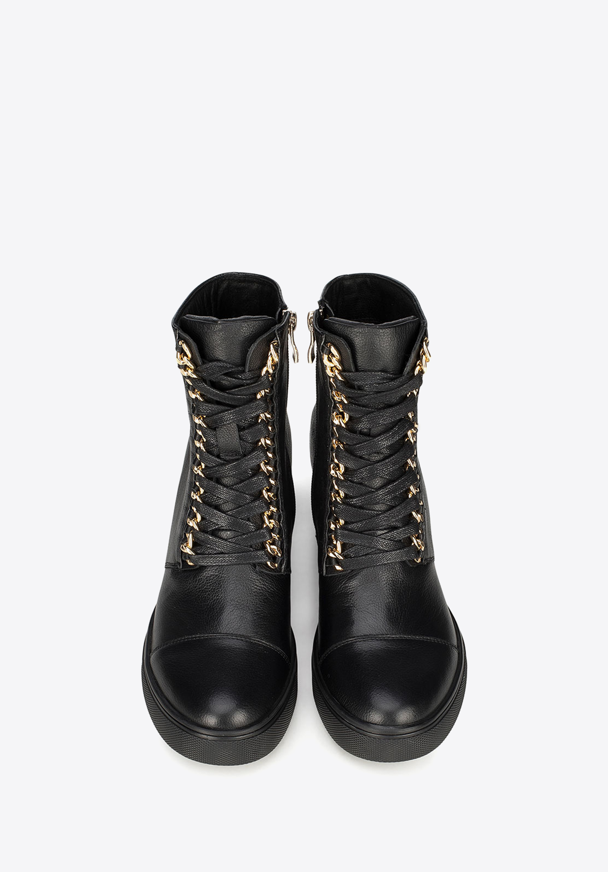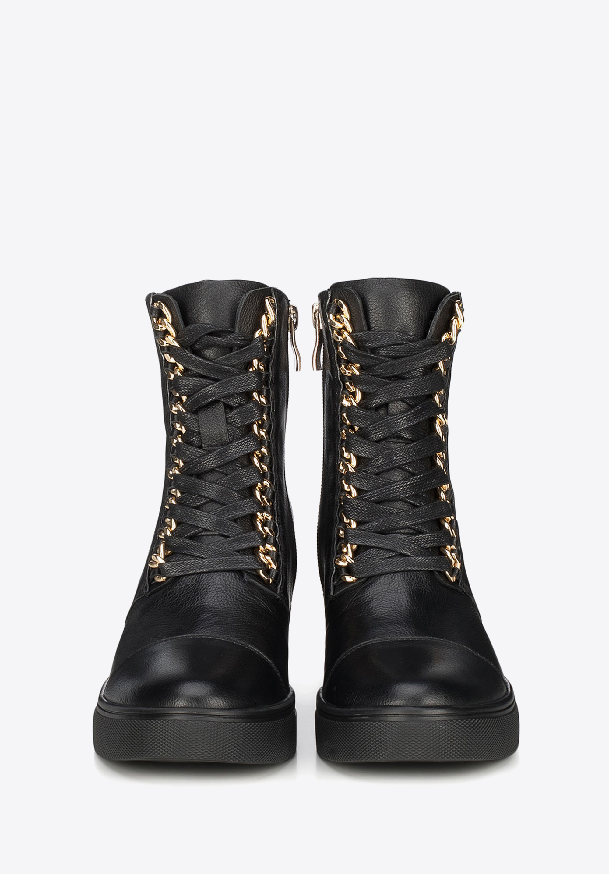 Schwarze Keilstiefel aus hochwertigem Naturleder. In diesen dynamischen Stiefeln können Sie sich auf alles gefasst machen. Mit goldfarbenen Kettenakzenten und einem verdeckten Keilabsatz für Komfort und Stil. Unser Tipp : Schlichtes und dennoch stylisches Design - perfekt für die Kombination mit lässigen Outfits .
