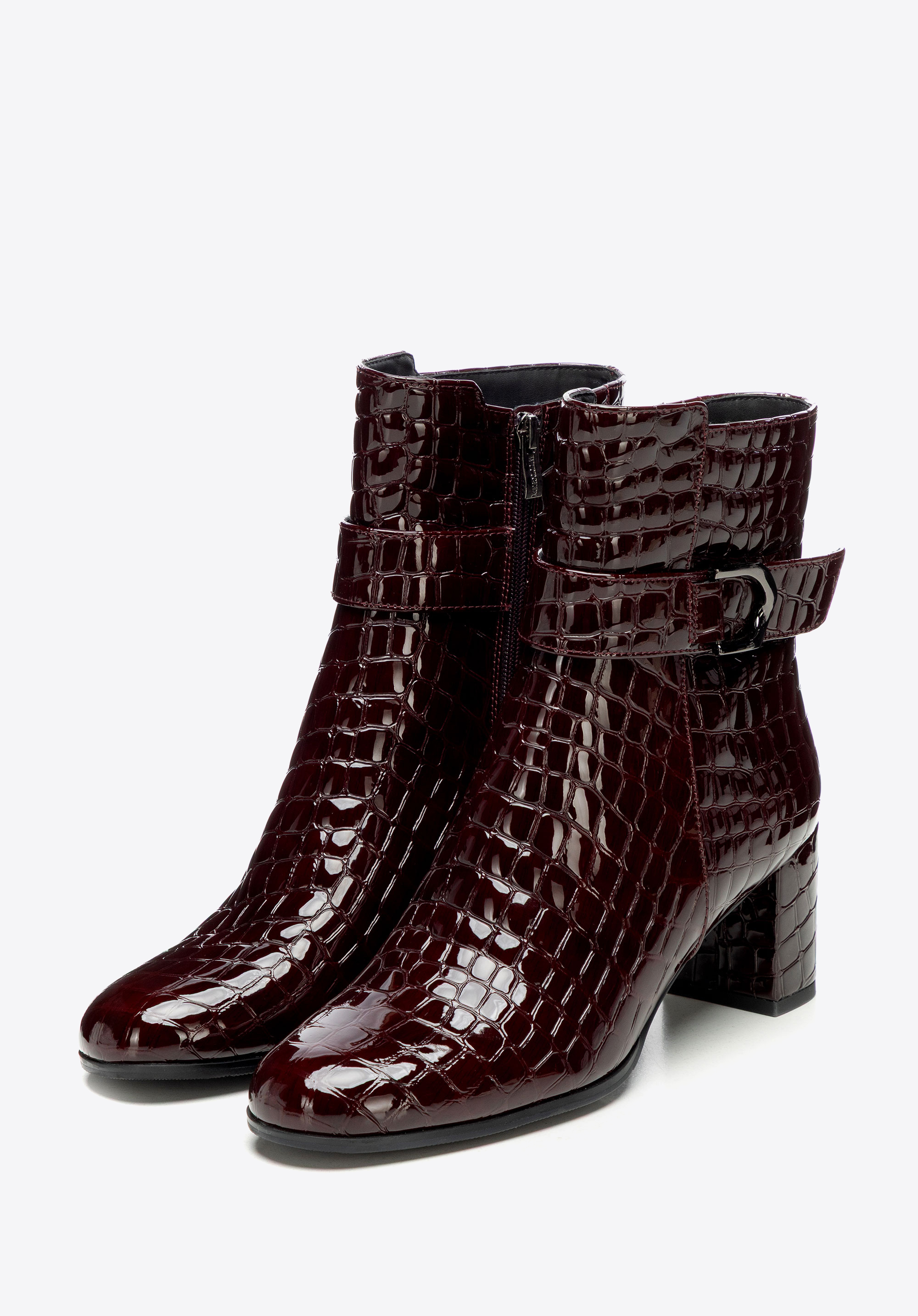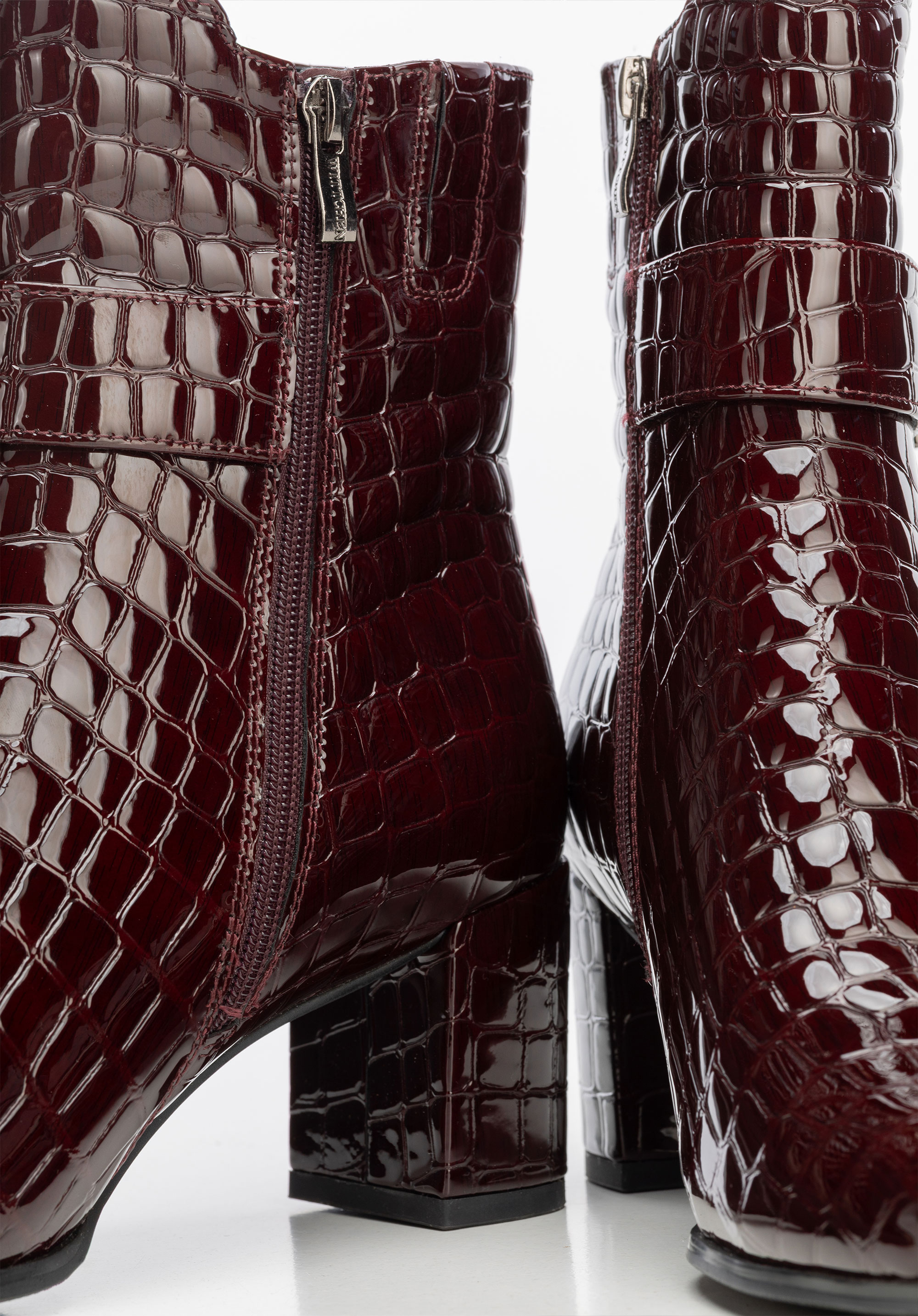 Zeitlose Eleganz mit modernem Touch – diese Damenstiefeletten aus Lackleder mit Kroko-Optik bestechen durch ihr glänzendes Finish. Die mandelförmige Spitze und der dekorative Riemen verleihen dem Schuh eine feminine Note, während der Blockabsatz Stabilität und Eleganz vereint und Ihnen Sicherheit und ganztägigen Tragekomfort bietet.