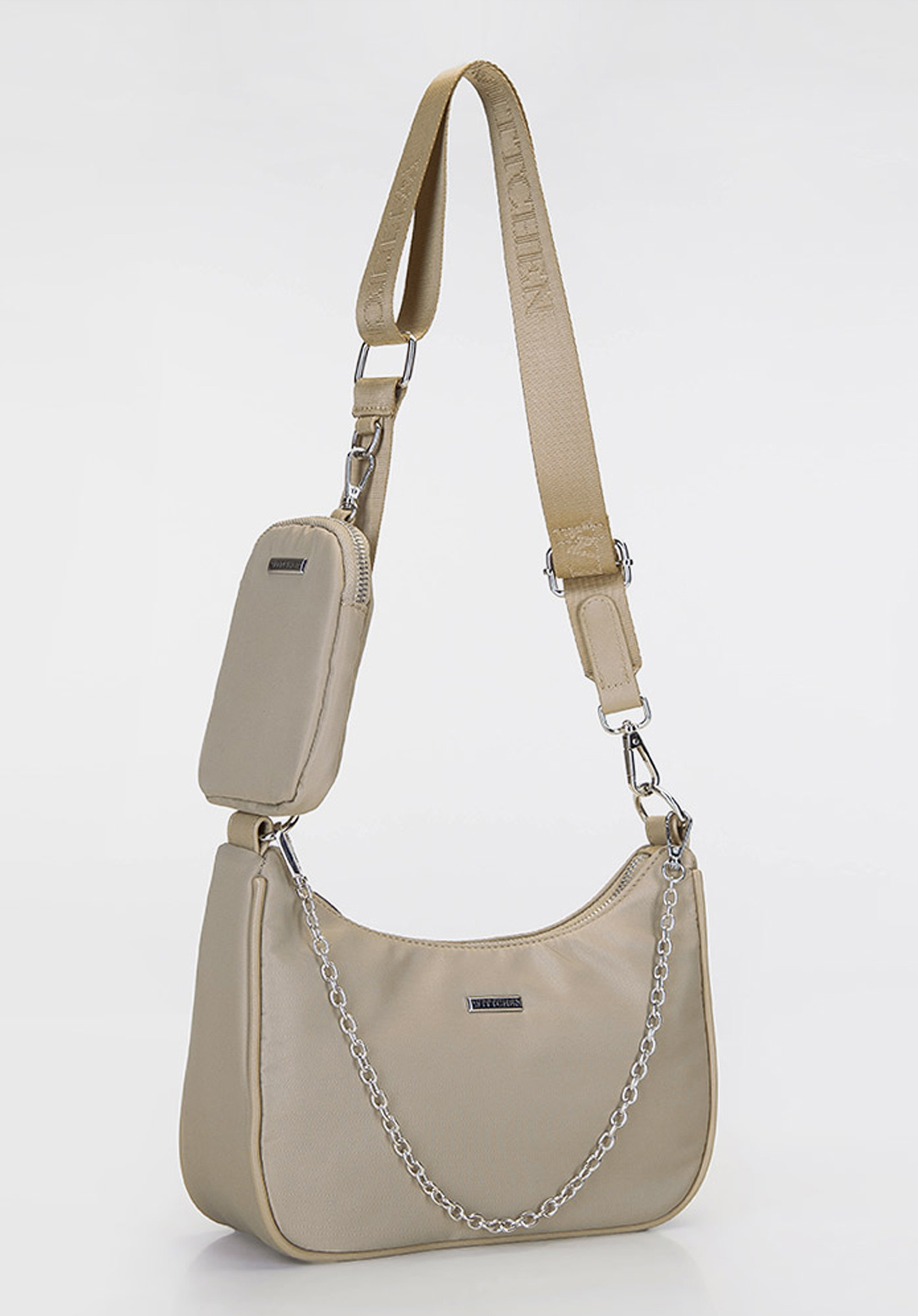 Die kleine Damen Umhängetasche in Form eines Hörnchens nimmt Bezug auf die neuesten Trends, aber in einer originellen Ausführung. Die Tasche ist aus hochwertigem, dickem Stoff mit leichtem Glanz und Einsätzen aus ökologischem Leder genäht. Die modische Form, sowie die kleine Kette mit Karabinerhaken und das aufsteckbare Täschchen werden viele Blicke auf sich ziehen. Sie können kleine Kosmetika in den Beutel stecken, ihn abnehmen und separat verwenden oder in der Tasche aufbewahren. Die Briefträgertasche hingegen bietet Platz für das Nötigste: Geldbörse, Sonnenbrille, Schlüssel und Taschentücher. Vervollständigen Sie Ihren Frühlings-/Sommer-Look mit einer Stofftasche aus Horn, zu der Sie gerne greifen werden.