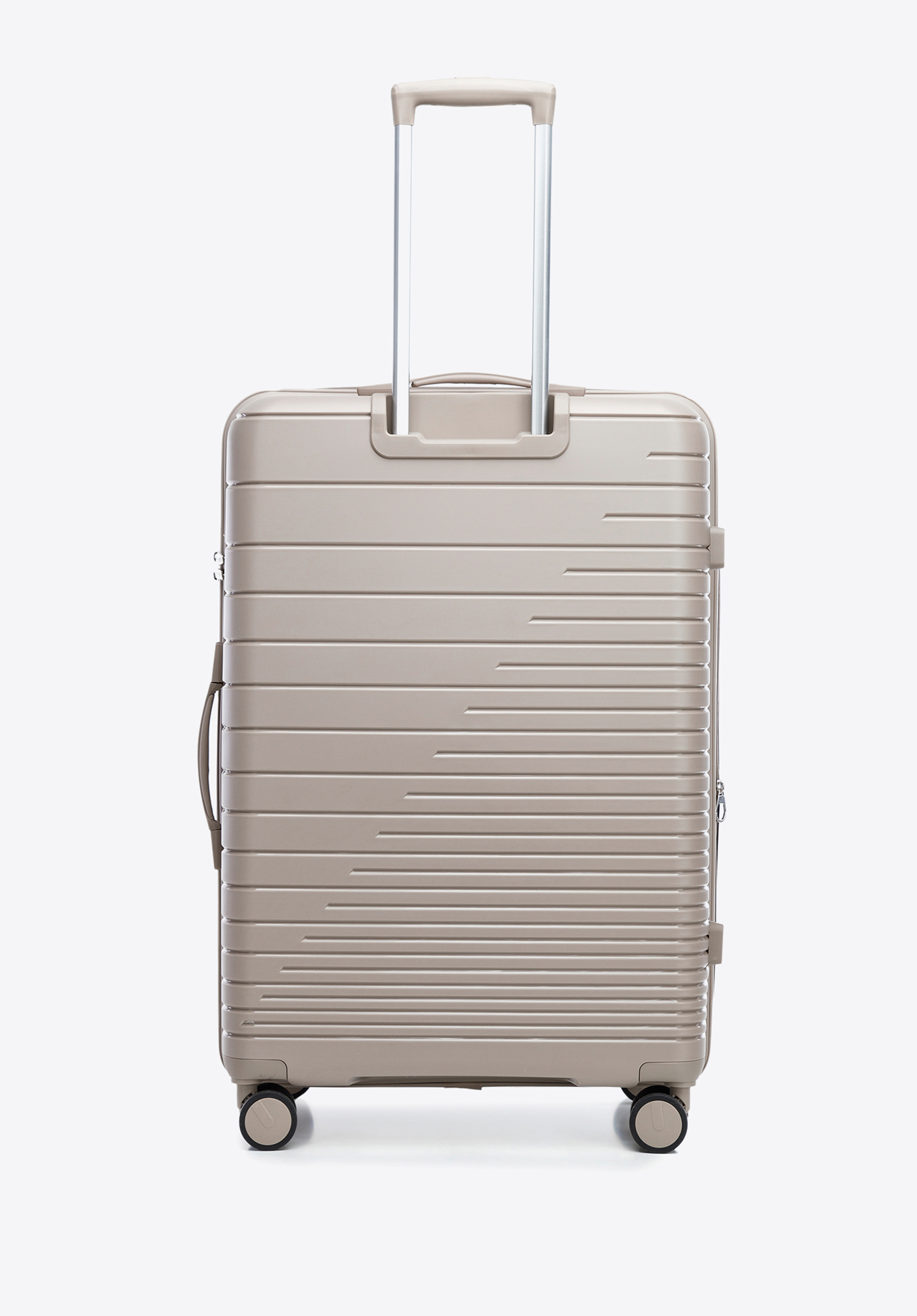 Dieser große Koffer ist eine praktische und stilvolle Wahl für jeden Reiseliebhaber. Mit einer Erweiterungsoption von 4 cm können Sie ihn vor und während Ihrer Reise leicht an Ihre Bedürfnisse anpassen. Er besteht aus hochwertigem Polypropylen, ist also leicht und sehr flexibel. Der matte Körper ist mit glänzenden Querstreifen verziert, die ihm einen modernen Look verleihen.