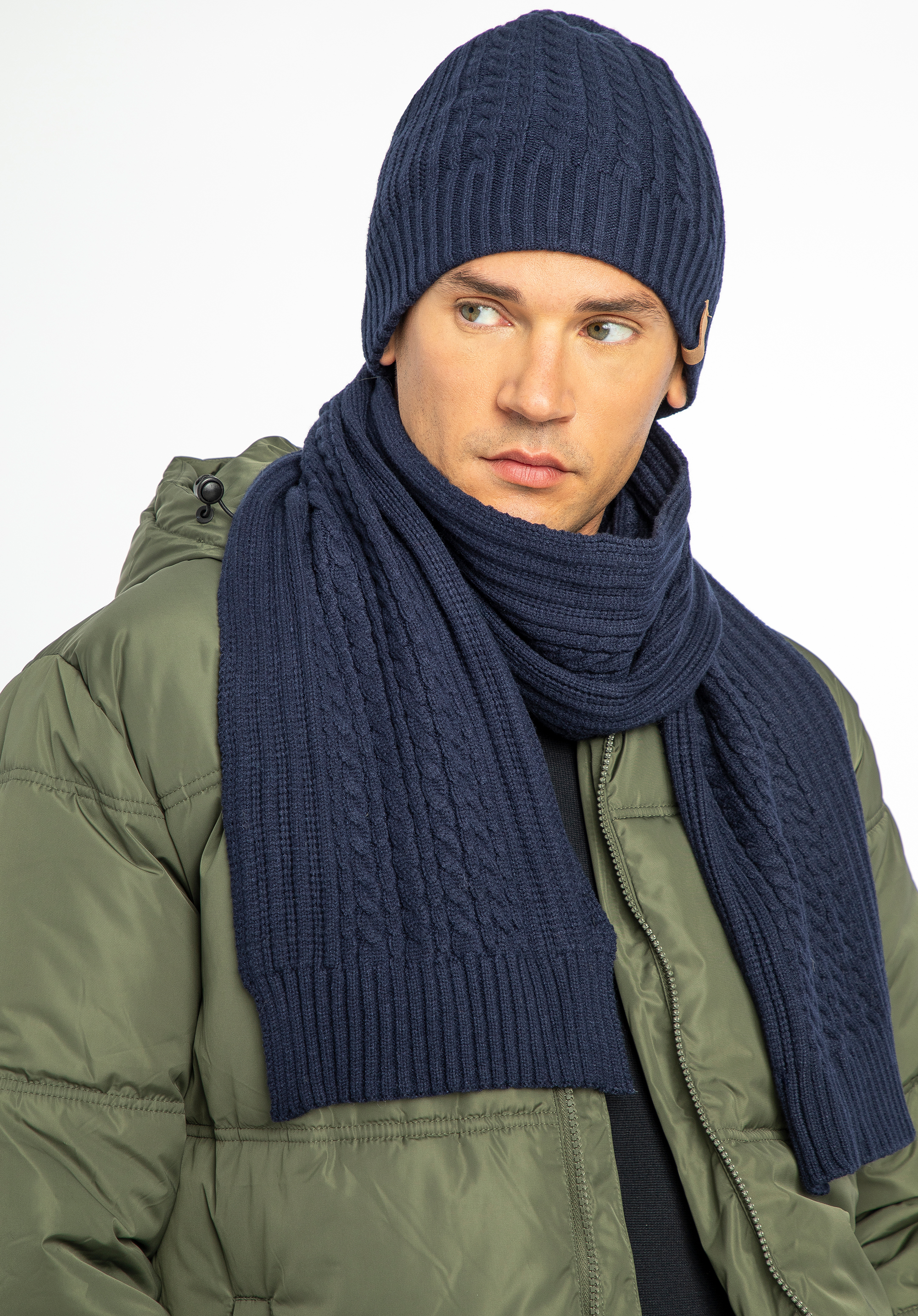 Entdecken Sie das perfekte Winterset für Herren (Mütze und Schal), das Eleganz und Komfort vereint. Aus einer hochwertigen Mischung aus Viskose, Polyester und Nylon gefertigt, bietet es eine außergewöhnliche Weichheit und ein angenehmes Tragegefühl und ist somit ein reines Vergnügen. Einzigartige Muster und verschiedene Webarten in unterschiedlichen Breiten verleihen ihm einen modernen Touch.