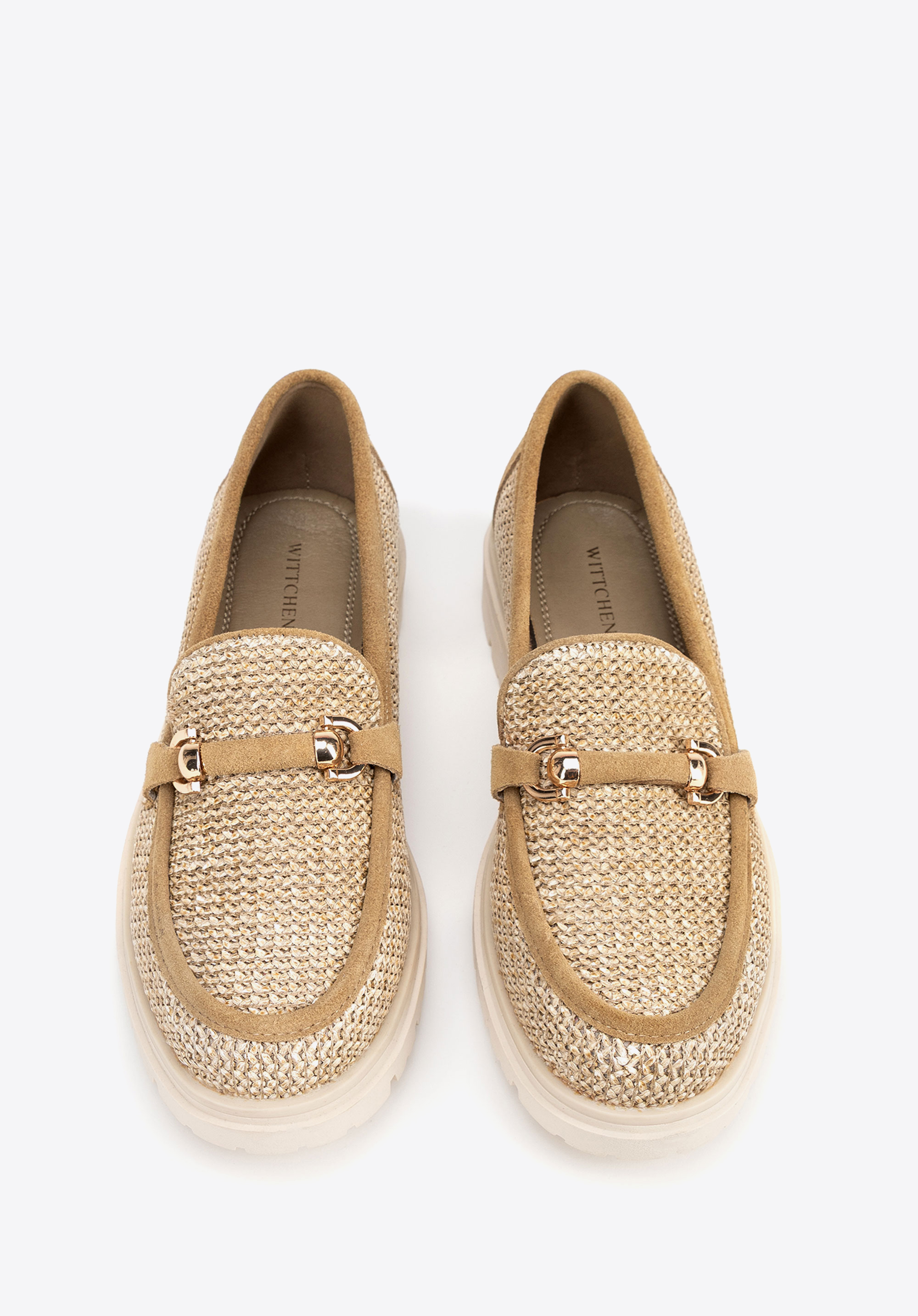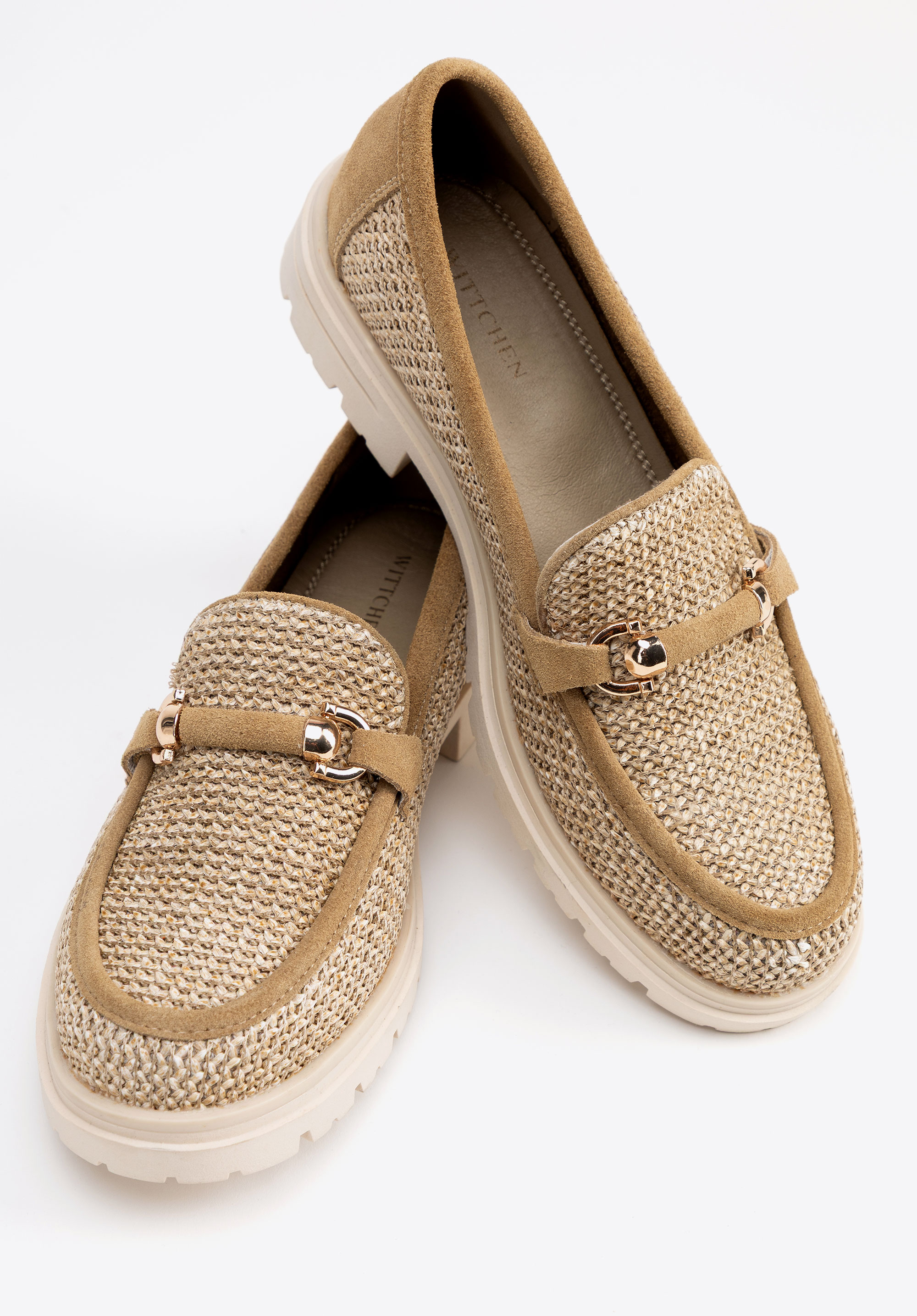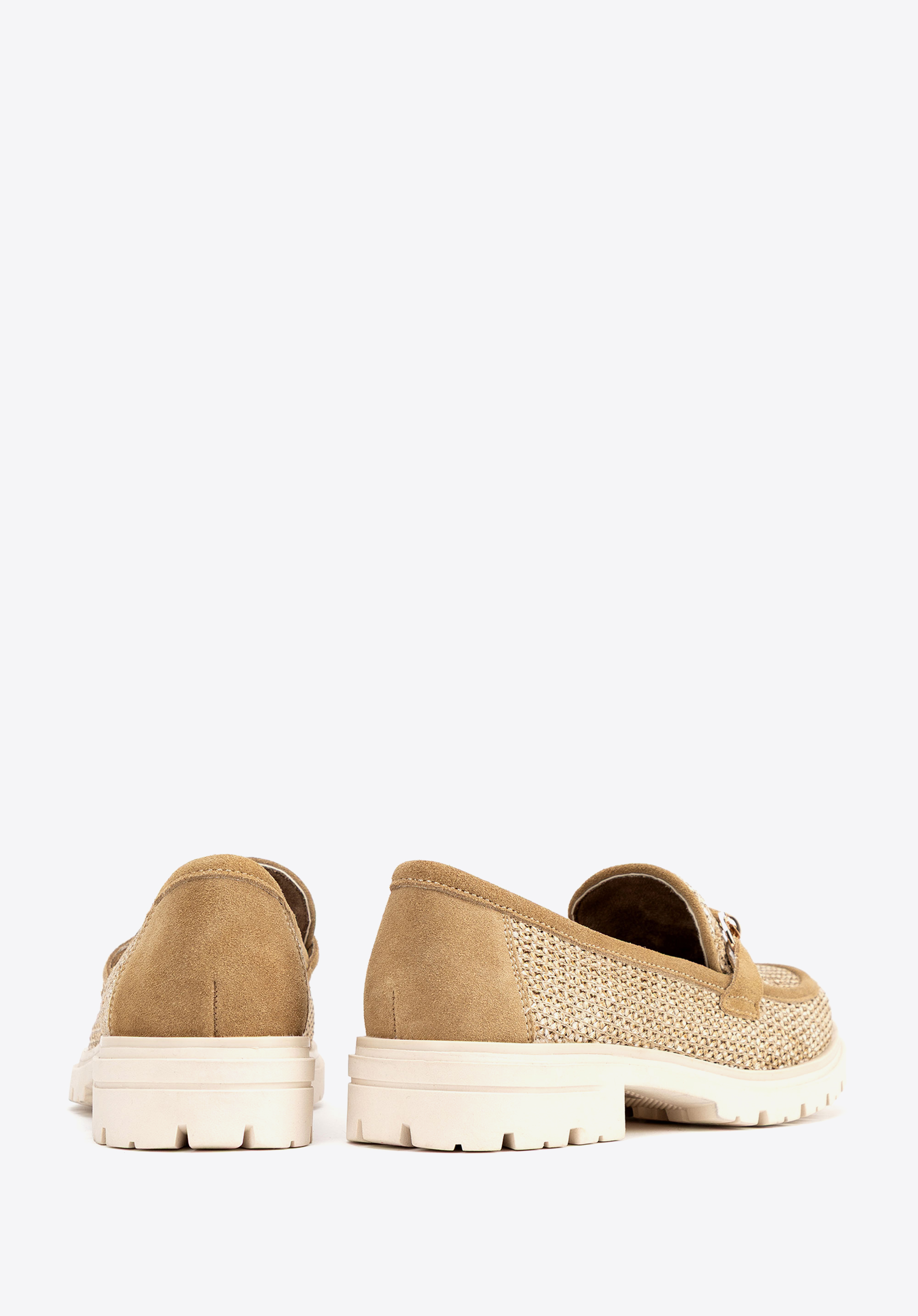 Veredeln Sie Ihren Stil mit Loafern , die natürliche Eleganz mit modernem Design verbinden. Dieses Modell aus auffälligem Kunstbast und weichem Wildleder besticht durch seine einzigartige Webstruktur und die dekorative Schnalle und verleiht ihm einen Hauch von Raffinesse. Die Slip-On-Konstruktion sorgt für Komfort, während die Plateausohle die Silhouette dezent streckt und so Stabilität und Tragekomfort bietet.