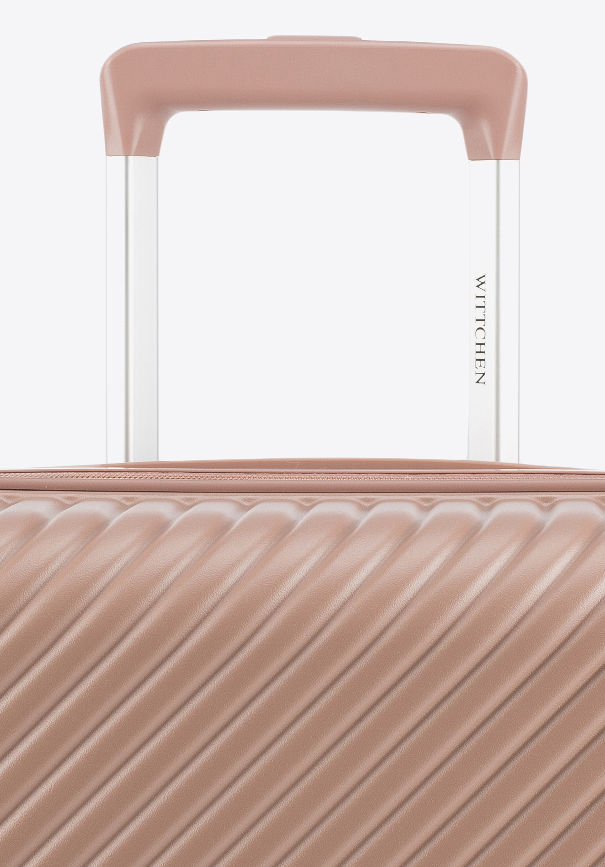 Das Kofferset wird aus Polycarbonat mit matter Oberfläche hergestellt. Die eleganten Koffer mit glänzenden Elementen in Roségold verfügen über vier Doppelrollen aus ABS-Material mit elastischer Beschichtung und einen geräumigen Innenraum, der mit beigefarbenem Futter mit WITTCHEN-Logo bedeckt wird. Dieses Modell ist in drei Farbtönen erhältlich: Weiß, Schwarz und Rosa.
