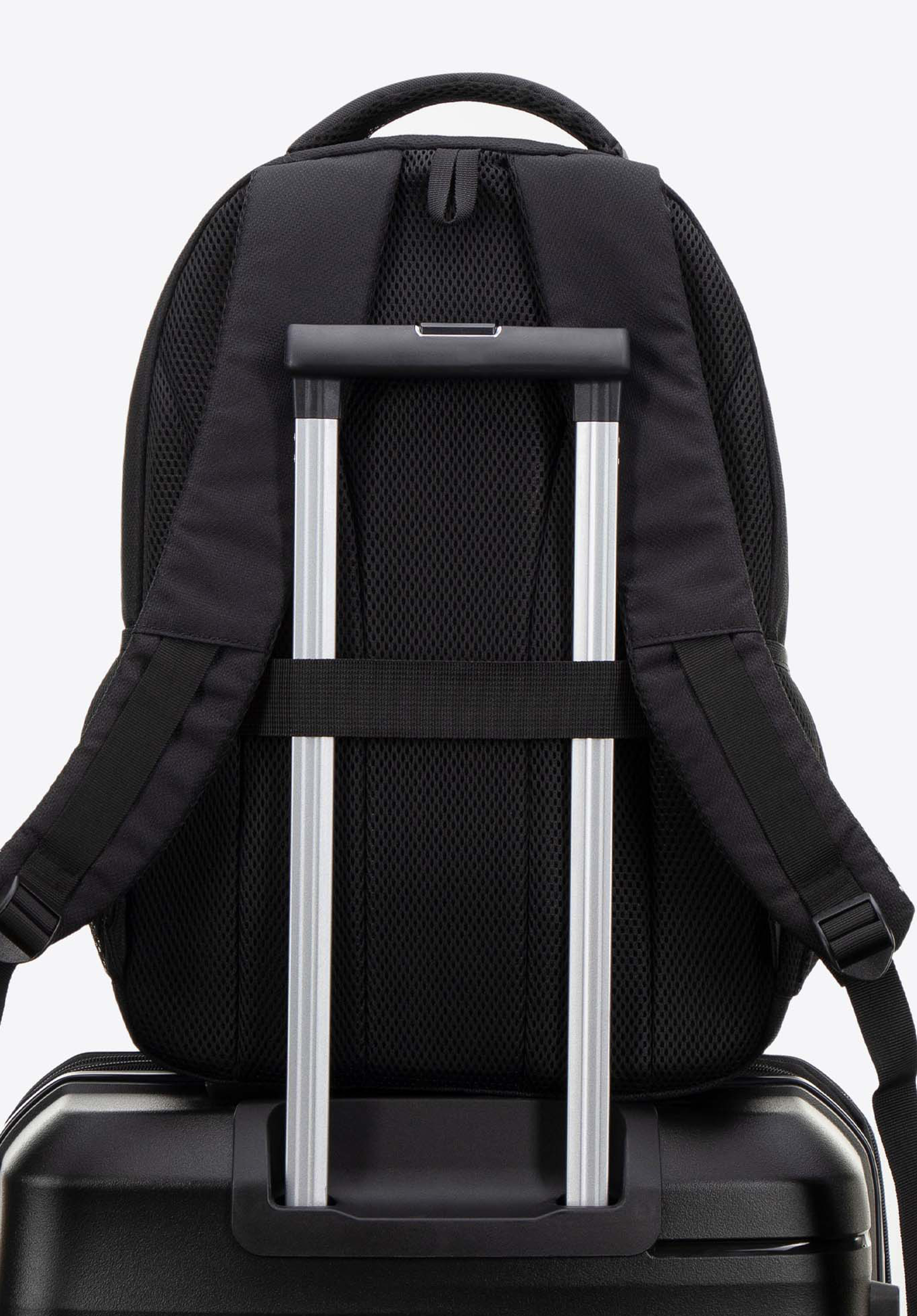 Unser Tipp: Dank Koffergurt lässt sich der Rucksack ganz einfach an einem kleinen Koffer befestigen und erleichtert so das Bewegen auf Flughäfen und Bahnhöfen.