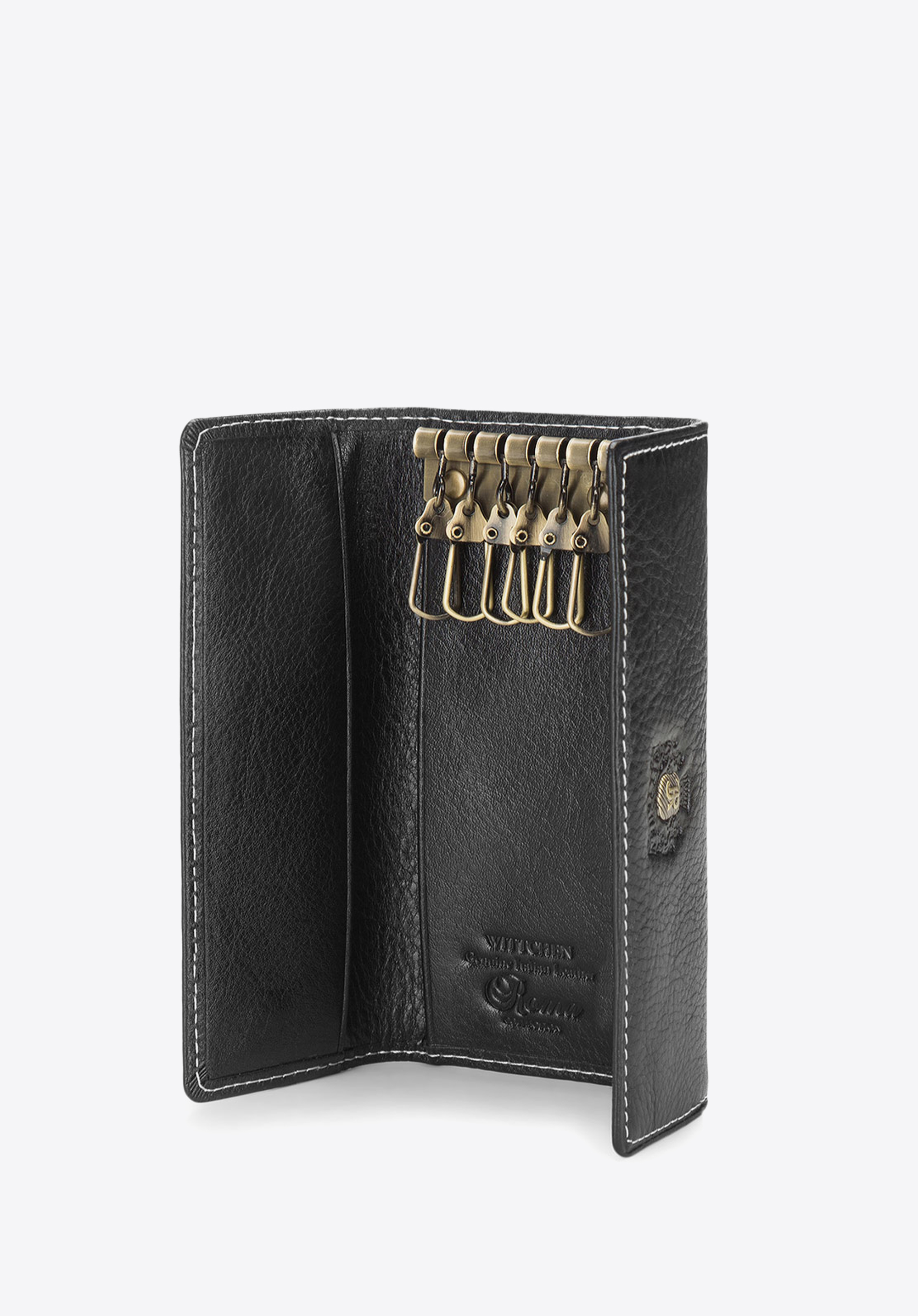 Ein klassisches Schlüsseletui mit einer rechteckigen Form und einem Schnitt, der leicht in jede Handtasche oder Aktentasche passt. Dieses Modell wurde aus hochwertigem Kalbsleder handgefertigt, dank dessen es sehr zuverlässig ist und Sie viele Jahre lang begleiten wird. Das Etui ist mit Ziernähten verziert und hat ein goldenes Logo mit dem WITTCHEN-Wappen. Das Schlüsseletui aus Echtleder mit Wappen ist in zwei Farben erhältlich: schwarz und rot.