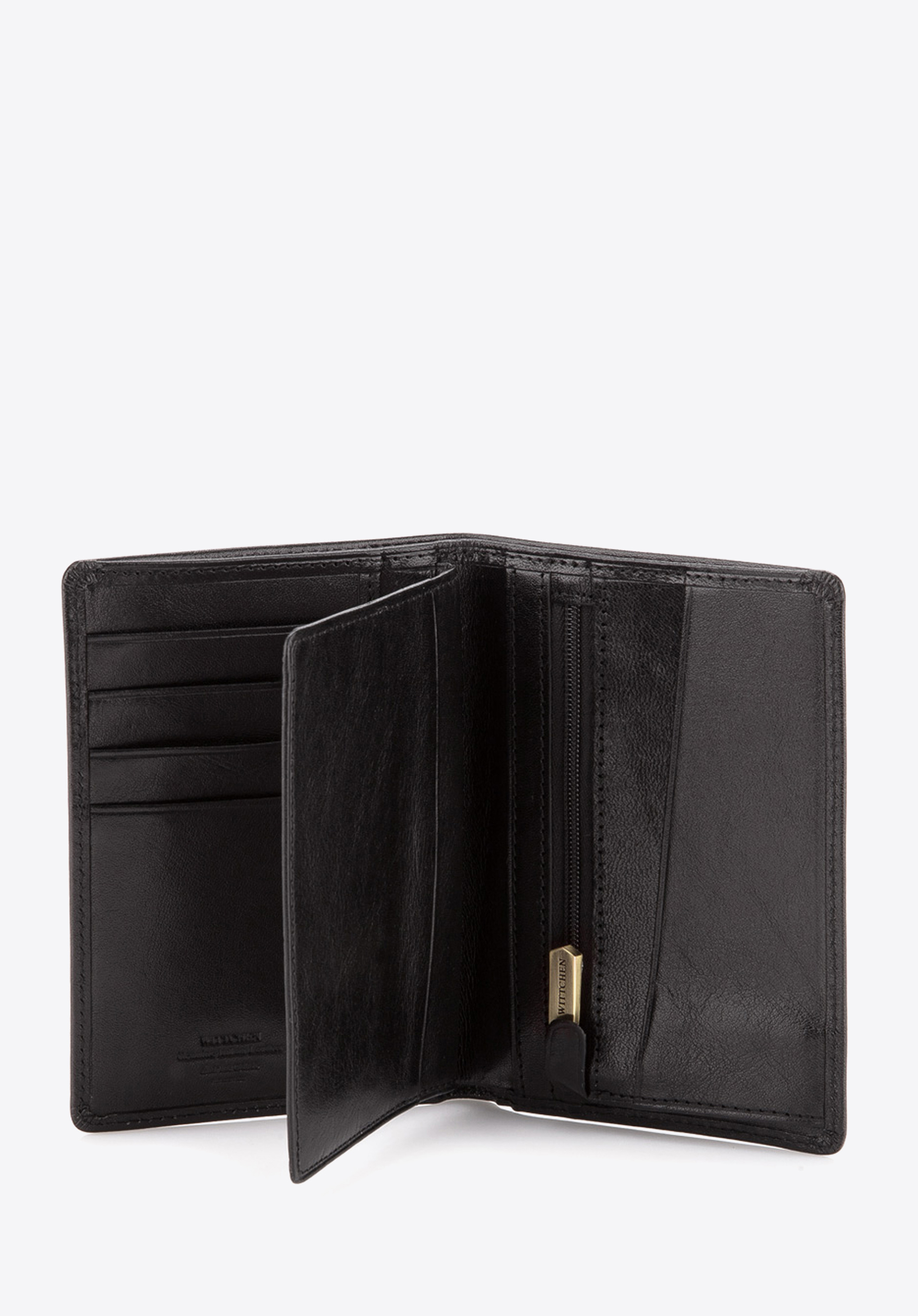 Die mittelgroße Geldbörse für Herren wird sorgfältig aus weichem und robustem Kalbsleder handgenäht. Dieses Modell im Hochformat ist ein perfektes Accessoire für alle Männer, die den elegnaten Stil und das einzigartige Design schätzen.
