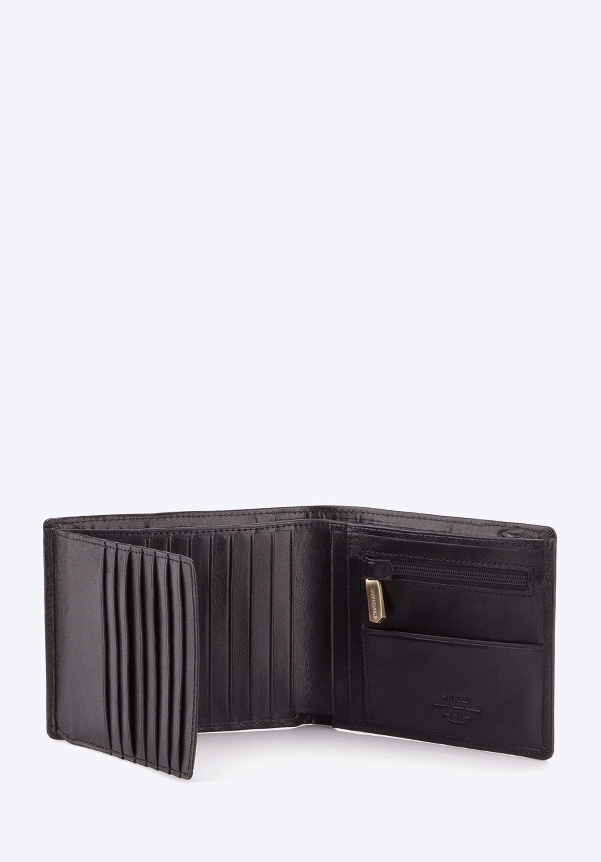 Der mittelgroße Geldbeutel für Herren wird sorgfältig aus sehr widerstandsfähigem Kalbsleder handgenäht. Dieses Modell im Querformat ist ein perfektes Accessoire für alle Männer, die den elegnaten Stil und die hochwertige Verarbeitung schätzen.