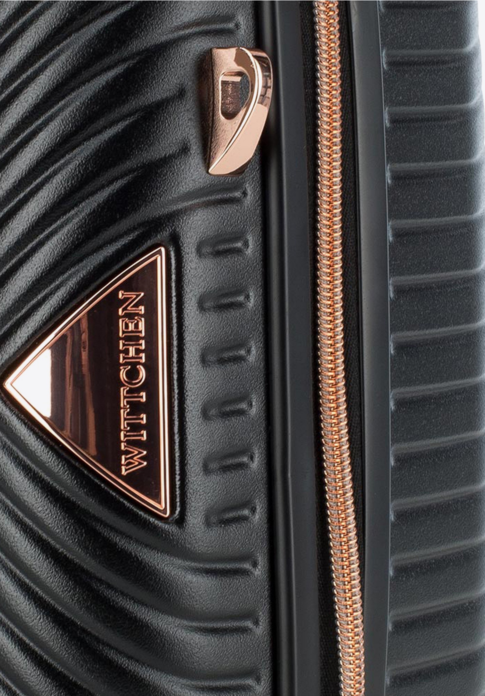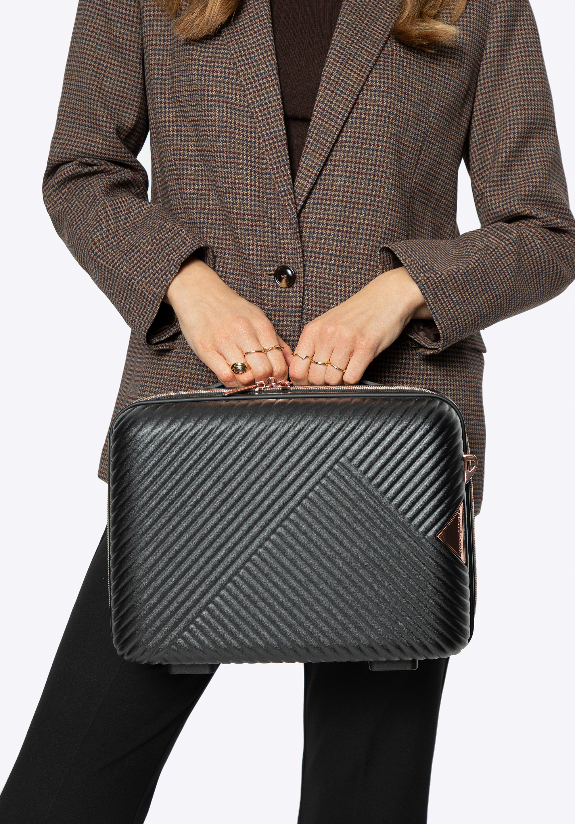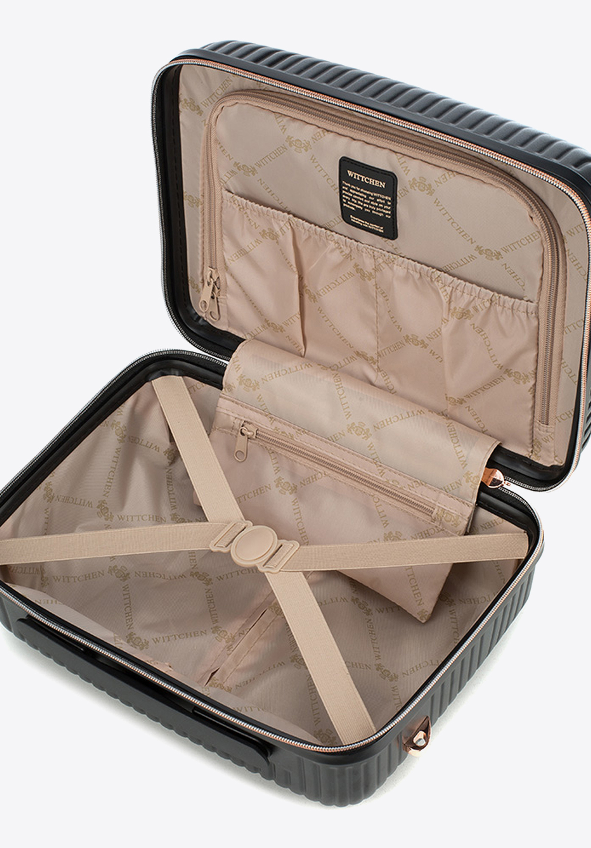 Der leichte Kosmetikkoffer wird aus Polycarbonat mit matter Oberfläche hergestellt. Das elegante Beauty Case wir mit glänzenden Elementen in Roségold geschmückt. Der Innenraum wird mit beigefarbenem Futter mit WITTCHEN-Logo bedeckt. Dieses Modell ist in drei Farbtönen erhältlich: Weiß, Schwarz und Rosa.